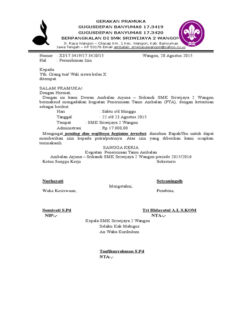 Contoh Surat Izin Orang Tua Untuk Kegiatan Persami Pramuka Sekolah
