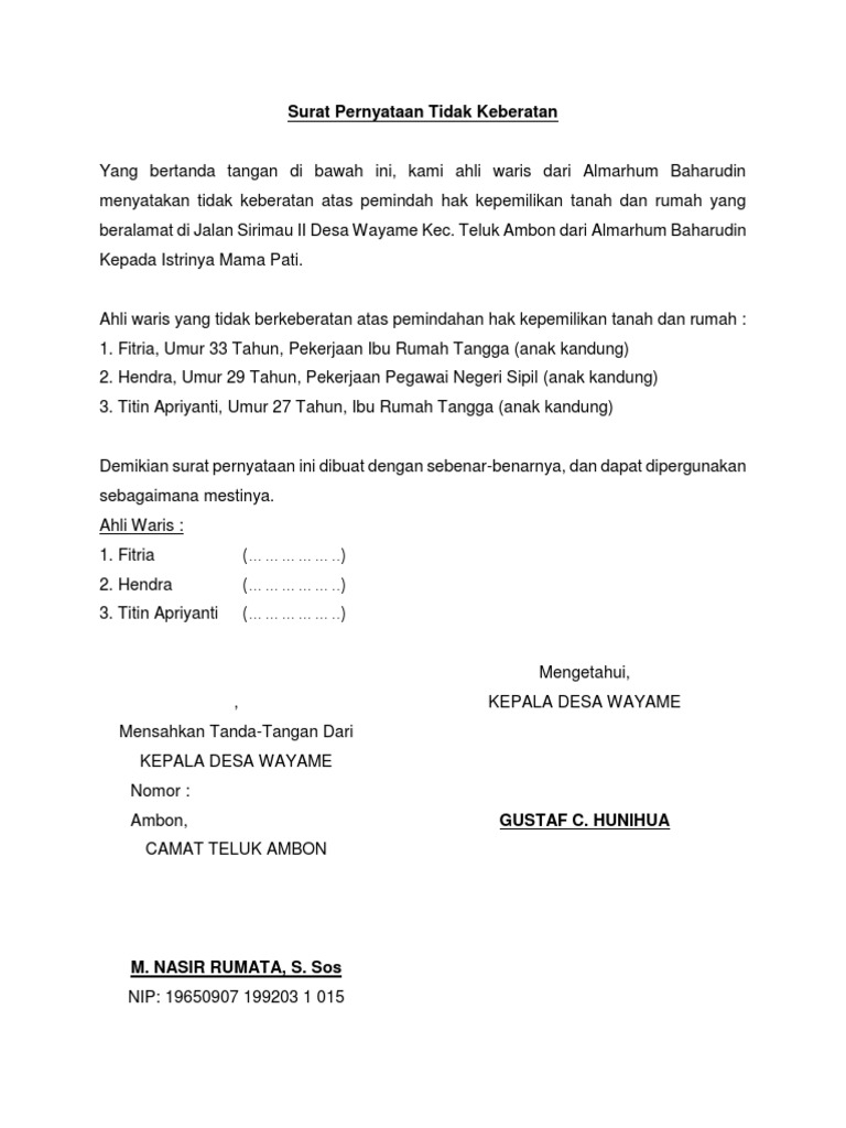 Surat Pernyataan Tidak Keberatan