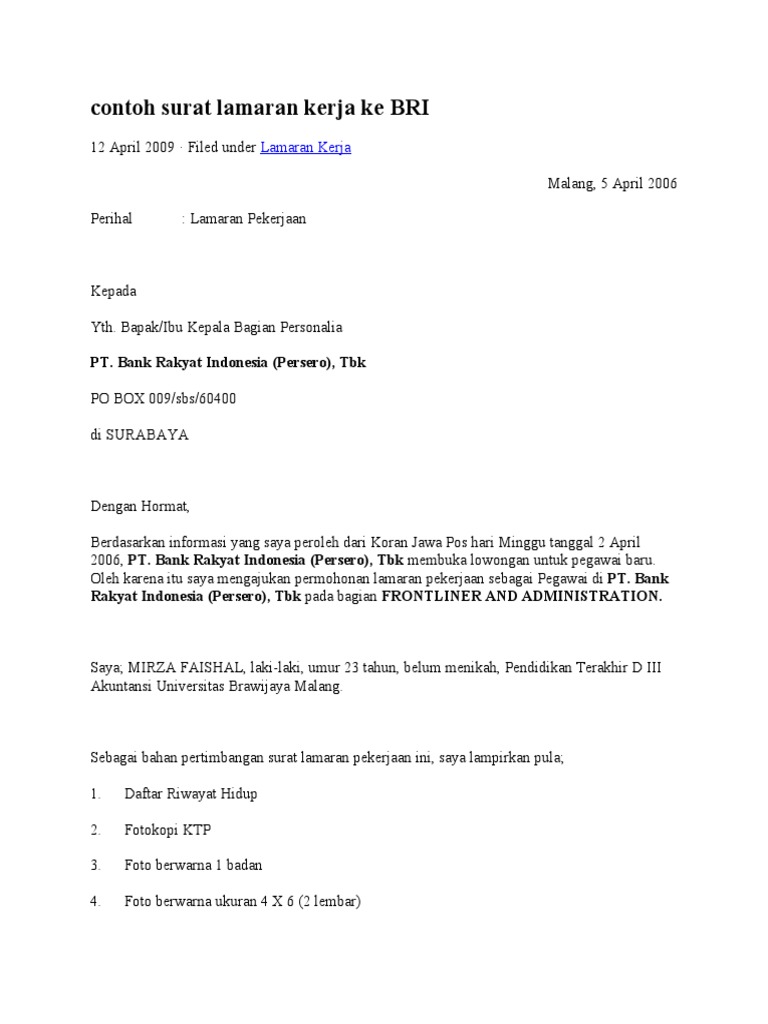 Contoh Surat Lamaran Kerja Bri